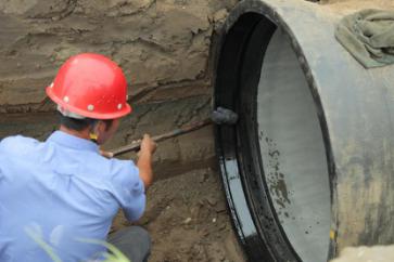一截管道安裝完畢,王俊鉆進(jìn)了管道中,沿著新鋪設(shè)的這截6米長(zhǎng)的管道,一邊爬一邊觀察,檢查管道接口處的皮圈是否有縫隙,有沒有受擠壓而外露。見皮圈處平整無(wú)縫,王俊才放心地爬了出來(lái)。盡管當(dāng)天氣溫不高,但管道中密不透風(fēng),讓人喘不過氣,一趟爬下來(lái),王俊的腦門上布了一層細(xì)細(xì)的汗珠。